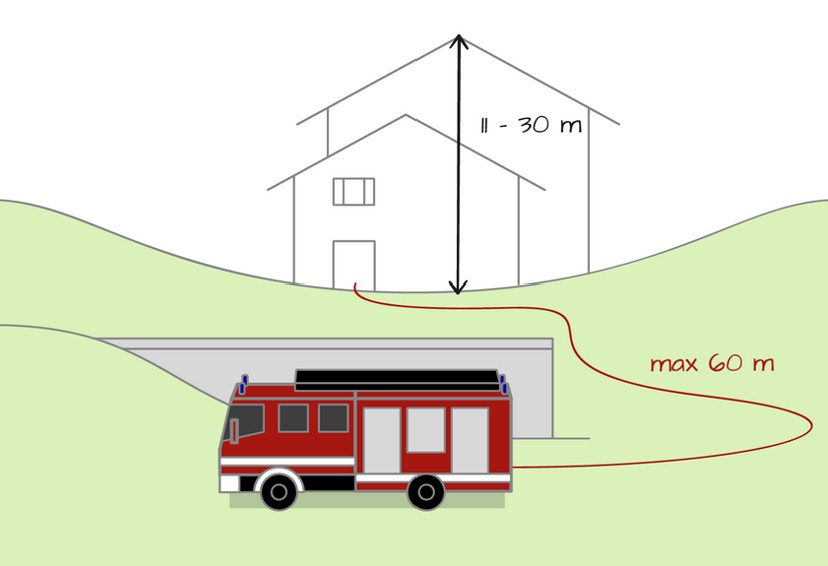 - Les accès réservés aux véhicules des sapeurs-pompiers doivent conduire aussi près que nécessaire du bâtiment afin de permettre une intervention efficace des sapeurs-pompiers. Pour les constructions avec une densité de circulation élevée, telles qu’exploitations de services et industrielles de grandes surfaces, installations industrielles et parking, les exigences d’accès sont déterminées dans chaque cas par l’autorité de protection incendie en accord avec les sapeurs-pompiers.