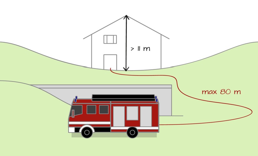 Des mesures de compensation doivent être prises si les conditions architecturales empêchent d’appliquer les mesures standard (p. ex. pour les lotissements en terrasse ou les bâtiments construits sur un terrain en pente avec accès pour les sapeurs-pompiers par le côté amont). L’autorité de protection incendie évalue ces mesures en concertation avec les sapeurs-pompiers.
